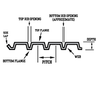 | 1 1/2 X 20 GA TYPE A (NR) METAL ROOF DECKING 1 1/2 X 20 GA TYPE A (NR) METAL ROOF DECKING/Asset/Narrow-Rib-Metal-Decking-Model.png | Depth (in) N/A 1-1/2 | Top Rib Opening (in) N/A 1 | Bottom Rib Opening (in) N/A 3/8 | Pitch (in) N/A 6 | Thickness (gauge) N/A 20 | Thickness (in) N/A 0.0358 | Weight Per Square Foot (lb) N/A 2.10 | Type N/A Type A (NR - Narrow Rib) | Finish N/A Bare Galvanized Painted |