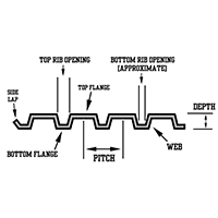 | 1 1/2 X 20 GA TYPE F (IR) METAL ROOF DECKING 1 1/2 X 20 GA TYPE F (IR) METAL ROOF DECKING/Asset/Intermediate-Rib-Metal-Decking-Model.png | Depth (in) N/A 1.5 | Top Rib Opening (in) N/A 1 3/4 | Bottom Rib Opening (in) N/A 1/2 | Pitch (in) N/A 6 | Thickness (gauge) N/A 20 | Thickness (in) N/A 0.0358 | Weight Per Square Foot (lb) N/A 2.1 | Type N/A Type F (IR - Intermediate Rib) | Finish N/A Bare Galvanized Painted |